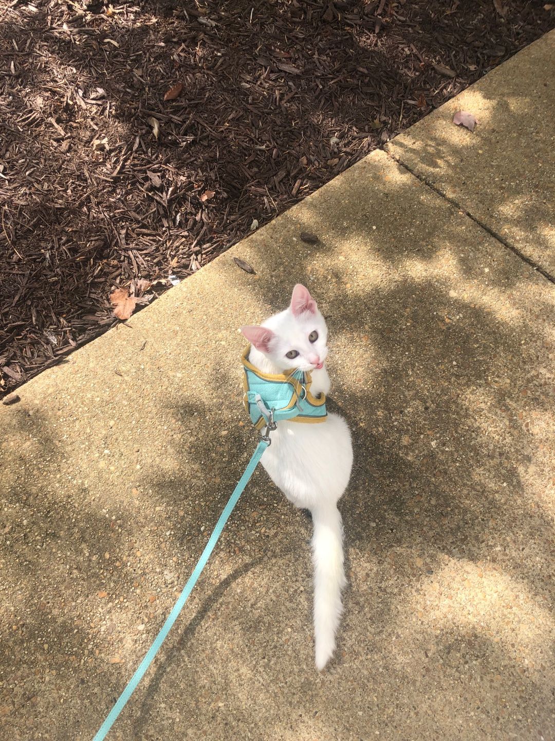 Dieses Katzengeschirr passt perfekt. Es ist einfach anzubringen und sehr leicht auf passende Größe einzustellen.