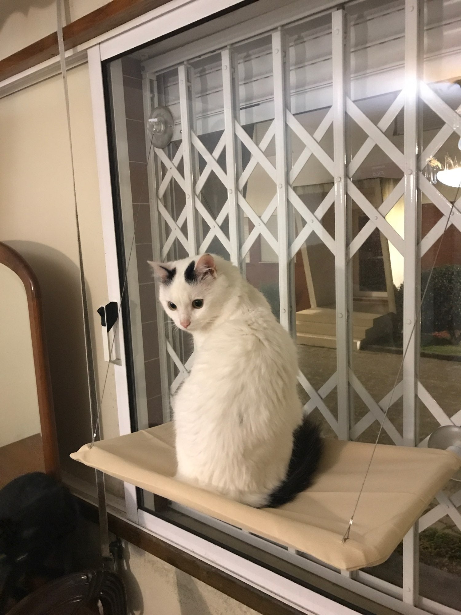 Beide Katzen lieben den Ausblick von der Hängematte und schlafen ständig darauf.